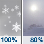 Temperature: 18°F Wind Speed: 10 to 22 mph Wind Direction: W Forecast: Snow showers likely and areas of blowing snow. Mostly cloudy, with a low around 18. Chance of precipitation is 70%. |