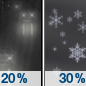 Temperature: 20°F Wind Speed: 9 mph Wind Direction: W Forecast: A chance of snow. Mostly cloudy, with a low around 20. Chance of precipitation is 50%. New snow accumulation of less than half an inch possible. |