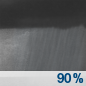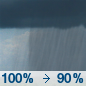 Forecast: Widespread rain showers. Cloudy, with a low around 72. South southwest wind around 8 mph. Chance of precipitation is 90%. New rainfall amounts between three quarters and one inch possible.