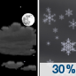 Temperature: 40°F Wind Speed: 5 to 15 mph Wind Direction: SW Forecast: A chance of snow after 4am. Partly cloudy, with a low around 40. |