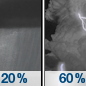 Temperature: 52°F Wind Speed: 10 to 20 mph Wind Direction: SW Forecast: A slight chance of rain showers before midnight, then showers and thunderstorms likely. Mostly cloudy, with a low around 52. Chance of precipitation is 60%. |