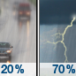 Temperature: 70°F Wind Speed: 6 to 10 mph Wind Direction: SE Forecast: A chance of rain before 4pm, then rain likely and a slight chance of thunderstorms. Cloudy, with a high near 70. Southeast wind 6 to 10 mph. Chance of precipitation is 70%. New rainfall amounts between a tenth and quarter of an inch possible. |