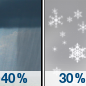Temperature: 25°F Wind Speed: 9 mph Wind Direction: S Forecast: A chance of snow showers. Mostly cloudy, with a low around 25. South wind around 9 mph. Chance of precipitation is 40%. New snow accumulation of less than half an inch possible. |