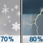 Temperature: 48°F Wind Speed: 6 to 16 mph Wind Direction: SSW Forecast: Rain likely before 10am, then snow likely and patchy fog between 10am and 11am, then showers and thunderstorms likely between 11am and 1pm, then rain. Mostly cloudy. High near 48, with temperatures falling to around 45 in the afternoon. South southwest wind 6 to 16 mph. Chance of precipitation is 80%. New rainfall amounts less than a tenth of an inch possible. |