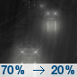 Temperature: 47°F Wind Speed: 2 mph Wind Direction: NW Forecast: Rain likely before 4am. Cloudy, with a low around 47. Northwest wind around 2 mph. Chance of precipitation is 70%. New rainfall amounts less than a tenth of an inch possible. |