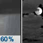 Temperature: 44°F Wind Speed: 5 to 10 mph Wind Direction: W Forecast: Rain showers likely before midnight. Mostly cloudy, with a low around 44. West wind 5 to 10 mph. Chance of precipitation is 60%. |