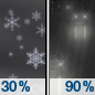 Temperature: 22°F Wind Speed: 0 to 5 mph Wind Direction: S Forecast: A chance of snow after 9pm. Mostly cloudy, with a low around 22. Chance of precipitation is 30%. |