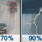 Temperature: 37°F Wind Speed: 10 to 15 mph Wind Direction: SW Forecast: Showers and thunderstorms before 9pm, then a chance of showers and thunderstorms between 9pm and 10pm, then showers and thunderstorms between 10pm and 1am, then a chance of rain between 1am and 2am. Mostly cloudy. Low around 37, with temperatures rising to around 43 overnight. Southwest wind 10 to 15 mph, with gusts as high as 30 mph. Chance of precipitation is 90%. New rainfall amounts between a quarter and half of an inch possible. |