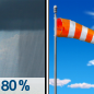 Temperature: 45°F Wind Speed: 15 to 22 mph Wind Direction: W Forecast: Rain showers before 7am. Sunny, with a high near 45. Chance of precipitation is 80%. |