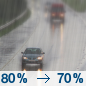 Temperature: 54°F Wind Speed: 15 to 20 mph Wind Direction: SW Forecast: Rain. Mostly cloudy, with a high near 54. Chance of precipitation is 80%. |