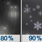 Temperature: 25°F Wind Speed: 16 to 21 mph Wind Direction: W Forecast: Snow showers before 7am, then snow showers likely and areas of blowing snow. Mostly cloudy, with a high near 25. Chance of precipitation is 80%. |