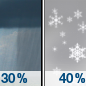 Temperature: 40°F Wind Speed: 5 mph Wind Direction: WNW Forecast: A chance of snow showers. Partly sunny. High near 40, with temperatures falling to around 32 in the afternoon. West northwest wind around 5 mph. Chance of precipitation is 30%. New snow accumulation of less than half an inch possible. |