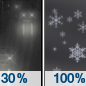 Temperature: 12°F Wind Speed: 0 to 10 mph Wind Direction: SW Forecast: Snow likely. Mostly cloudy, with a low around 12. New snow accumulation of less than one inch possible. |
