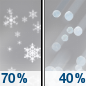 Temperature: 36°F Wind Speed: 5 mph Wind Direction: SE Forecast: Snow likely before 1pm, then a slight chance of sleet and a slight chance of rain and snow. Cloudy, with a high near 36. Chance of precipitation is 70%. New snow accumulation of less than one inch possible. Little or no ice accumulation expected. |