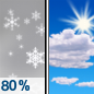 Temperature: 31°F Wind Speed: 12 to 18 mph Wind Direction: NW Forecast: Snow before 7am. Mostly sunny, with a high near 31. Wind chill values as low as -1. Northwest wind 12 to 18 mph, with gusts as high as 31 mph. Chance of precipitation is 80%. New snow accumulation of 2 to 4 inches possible. |
